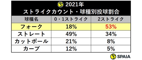 そして2ストライクになると、極端にフォーク中心の配球となる。2ストライクで落ちる球の割合が増えるのは一般的とはいえ、50%を超える投手は12球団にも数えるほどしかいない。