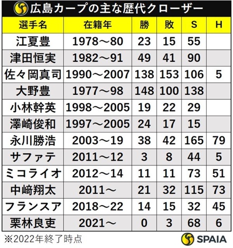 投手の分業制が確立され、中継ぎ、リリーフ陣の重要性は年々増している。広島には歴代のチームを支えてきた名クローザーが多い。主なクローザーとその成績が下の表だ。