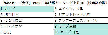 一般女性と比べて「濃いカープ女子」が検索する特徴的なキーワードから、2023年の関心を導き出した。上位10位は以下の通り。